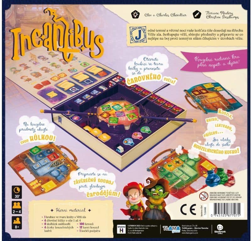 Incantibus je svižná a originální desková hra pro 2–4 hráče, která kombinuje sběr předmětů, rychlé rozhodování a souboje s příšerami i čaroději. Každý hráč má svůj kouzelnický kufr, do kterého sbírá zbraně, ingredience, lektvary a další žetony. Pomocí kouzelné hůlky se snaží získat ty nejlepší předměty dříve než ostatní – ale pozor, pokud se více hráčů zaměří na stejný žeton, rozhoduje síla hůlky! Pokud souboj prohrajete, hůlku si vyměníte se silnější hůlkou vítěze.