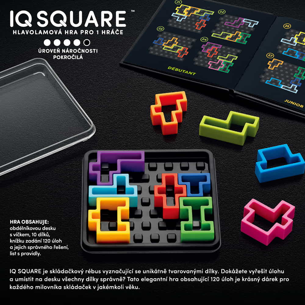 IQ SQUARE je skládačkový rébus vyznačující se unikátně tvarovanými dílky. Dokážete vyřešit úlohu a umístit na desku všechny dílky správně? Tato elegantní hra obsahující 120 úloh je krásný dárek pro každého milovníka skládaček v jakémkoli věku.