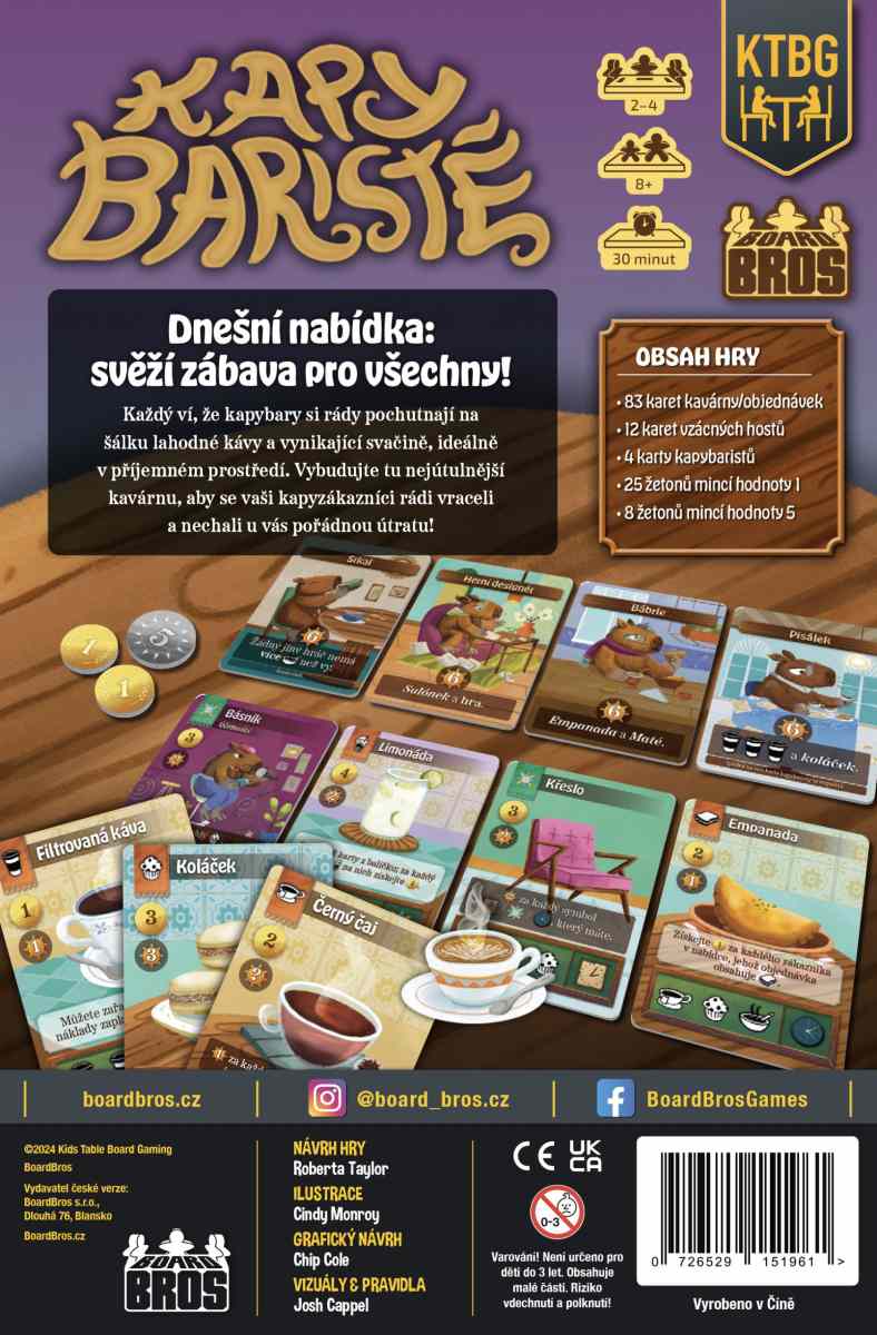 Mít svoji vlastní kavárničku je sen každé správné kapybary. Jenže rozjet takový byznys není tak snadné jako se napást čerstvé trávy, zvlášť když konkurence nespí! V této hře budete pomocí draftování karet chystat menu plné horkých nápojů i zákusků, zdobit interiér a především se starat o náročné zákazníky, kteří se nebojí říct, co chtějí. Pokud se z vaší kapykavárny stane ráj pro všechny milovníky kávy, zlaťáky se vám jen pohrnou. Není ale na co čekat, vaši spoluhráči také touží po úspěchu a tím nejlepším může být jen jeden z vás!