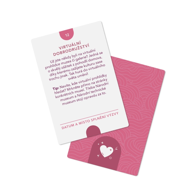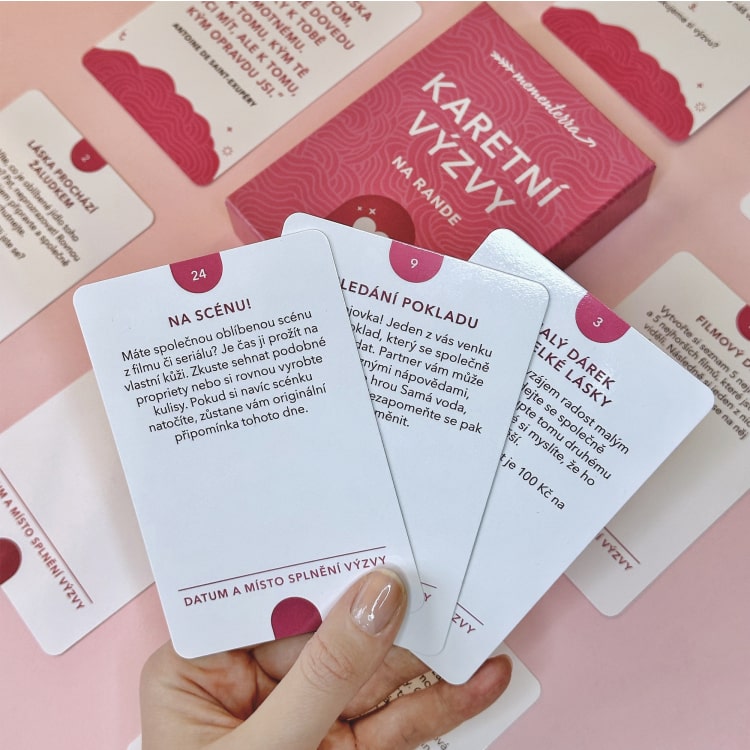 40 karet výzev, 5 karet pro vaše vlastní výzvy, 1 kartu s otázkami k zamyšlení, 1 kartu na odškrtávání výzev, 1 kartu s tematickým citátem, 1 kartu s tematickou afirmací, 1 vzorovou kartu a pravidla pro plnění výzev.