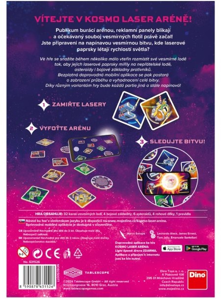 Kosmo laser aréna je svižná a originální desková hra, ve které rozhodují rychlé uvažování i prostorová představivost. Jedna partie trvá jen pár minut, ale pokaždé přinese jinou bitvu. Ideální hra pro všechny, kdo chtějí zažít vesmírnou bitvu rychlejší než světlo.