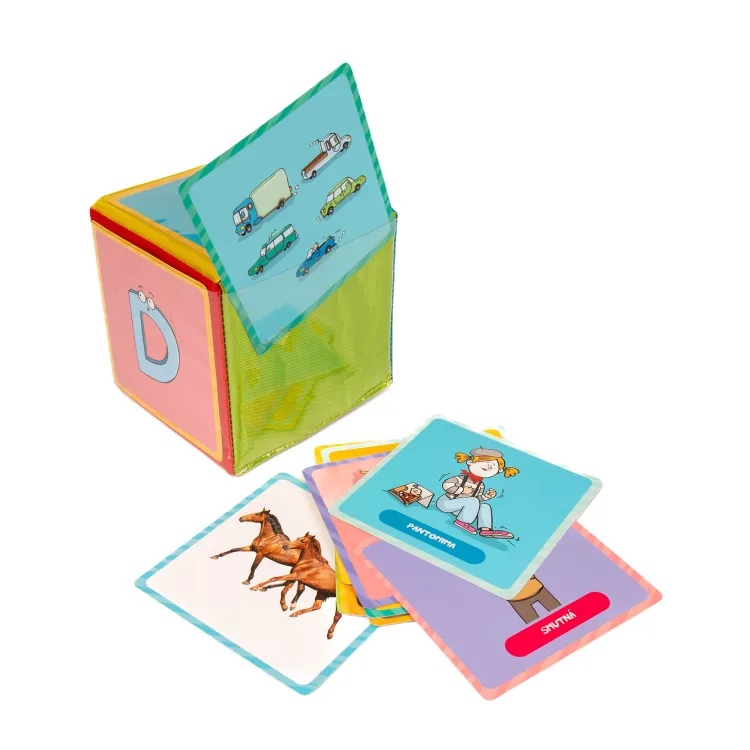 Měkká kostka s kapsami s 53 obrázkovými kartami a aktivitami pro předškoláky i školáky je variabilní pomůcka, kterou lze využít při hrách doma s dětmi, během domácí párty nebo v dětských kolektivech.