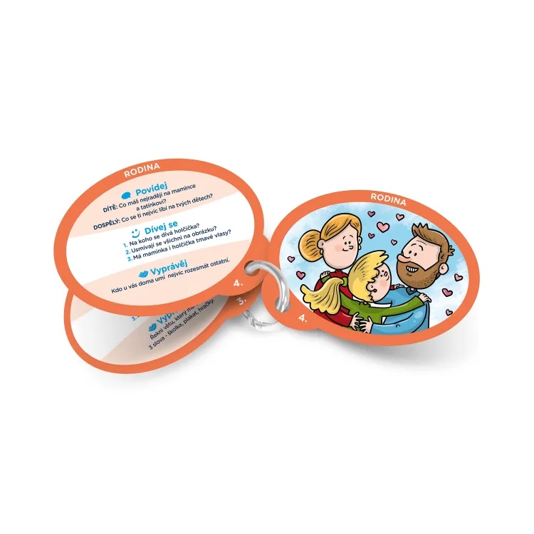 Na 40 oboustranných, obrázkových kartách najdete 200 otázek, které slouží k otevřenému povídání v rodině, vzájemnému poznávání, trénování postřehu, vyprávění a výzvám.