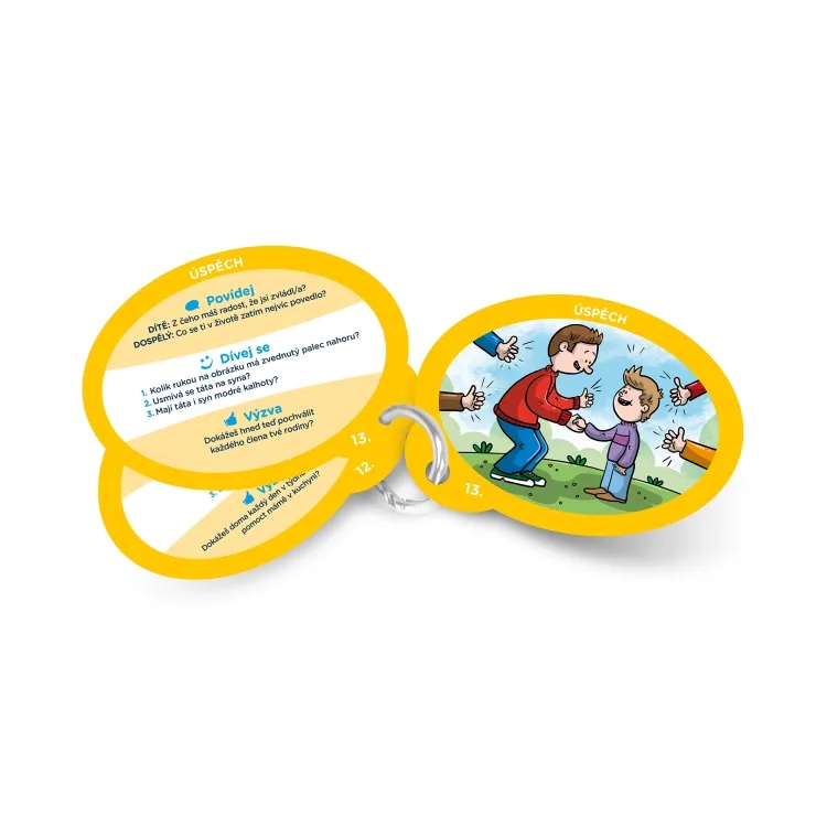 Na 40 oboustranných, obrázkových kartách najdete 200 otázek, které slouží k otevřenému povídání v rodině, vzájemnému poznávání, trénování postřehu, vyprávění a výzvám.