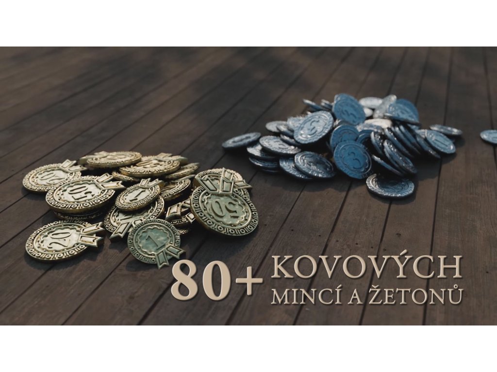 55 kovových žetonů vítězných bodů (hodnoty 1, 5, 20 a 50)
