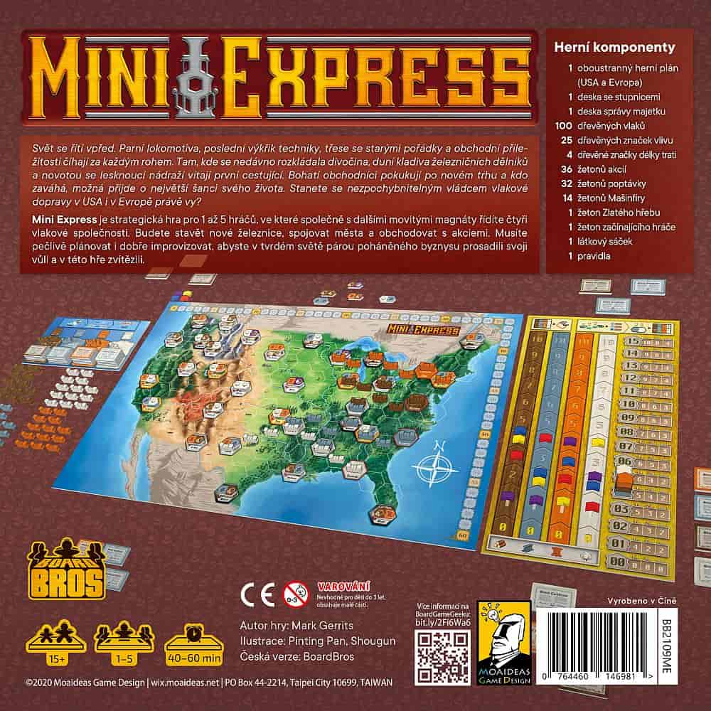 Rozšíření ke hře Mini Express přináší 4 nové mapy (Velká Británie, Taiwan, Japonsko, Španělsko). Každá z nich nabídne unikátní zážitek, který zpestří také volitelné přídavné moduly (podobné jako Zlatý hřeb na mapě USA a Přístavy na mapě Evropy).