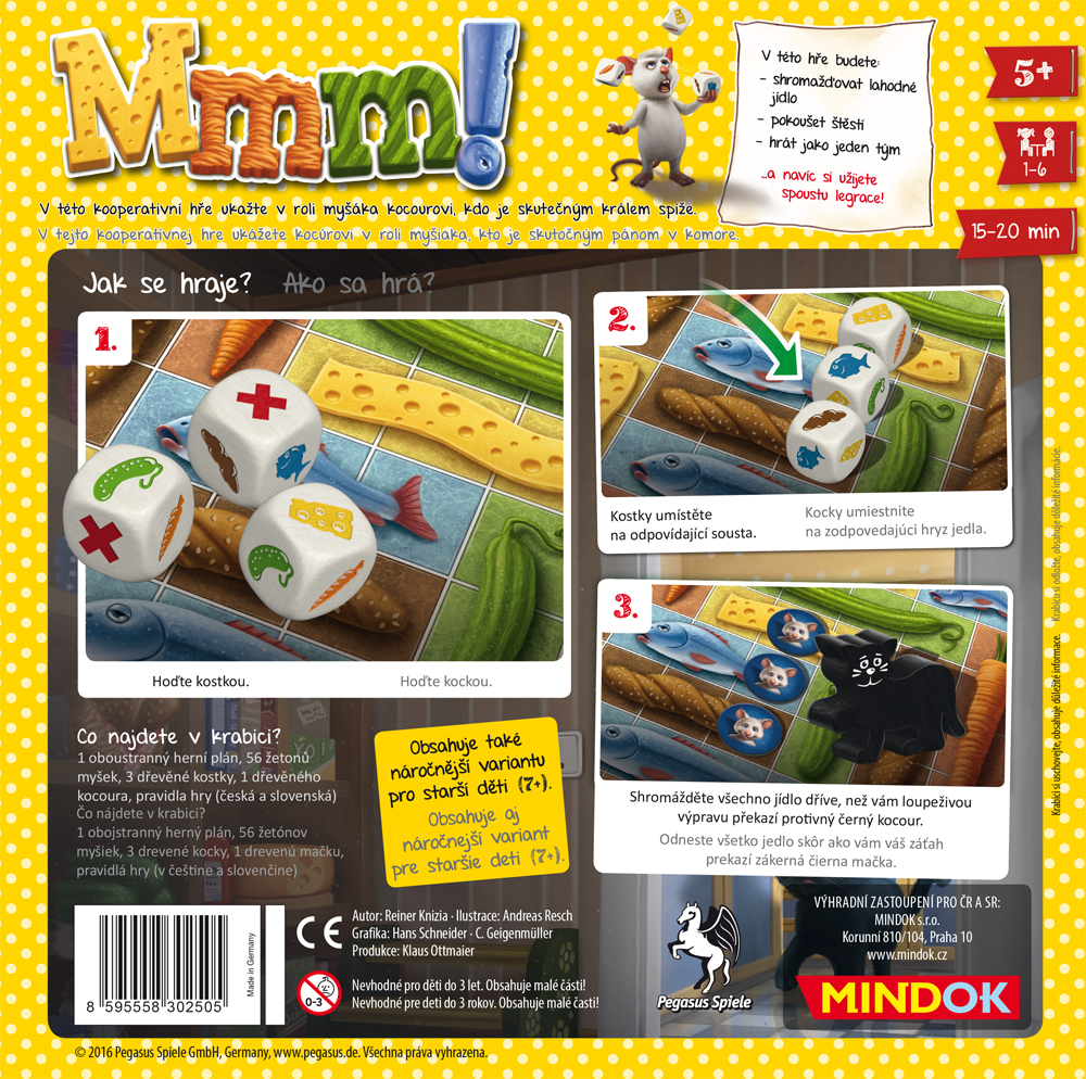 V této kooperativní hře ukažte v roli myšáka kocourovi, kdo je skutečným králem spíže. Hoďte kostkou, umístěte je na odpovídající sousta a shromážděte všechno jídlo dříve, než vám loupeživou výpravu překazí protivný černý kocour.