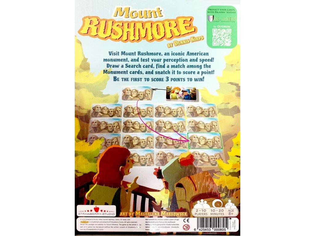 Ve hře Mount Rushmore se stanete návštěvníky ikonického amerického památníku Mount Rushmore a otestujete svůj postřeh a rychlost. Líznete kartu a najděte shodu z nabídky karet památníku rychleji než vaši soupeře. Pokud se vám to povede, dostanete 1 vítězný bod. Vyhrává ten, kdo jako první získá 3 body.