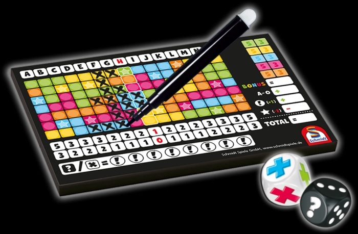 In Noch mal!, the dice determine which color and how many spaces you can mark off on your playing sheet — but the starting player may first evaluate what everyone's doing, then remove two dice, leaving everyone else to make their choices with the dice that remain...