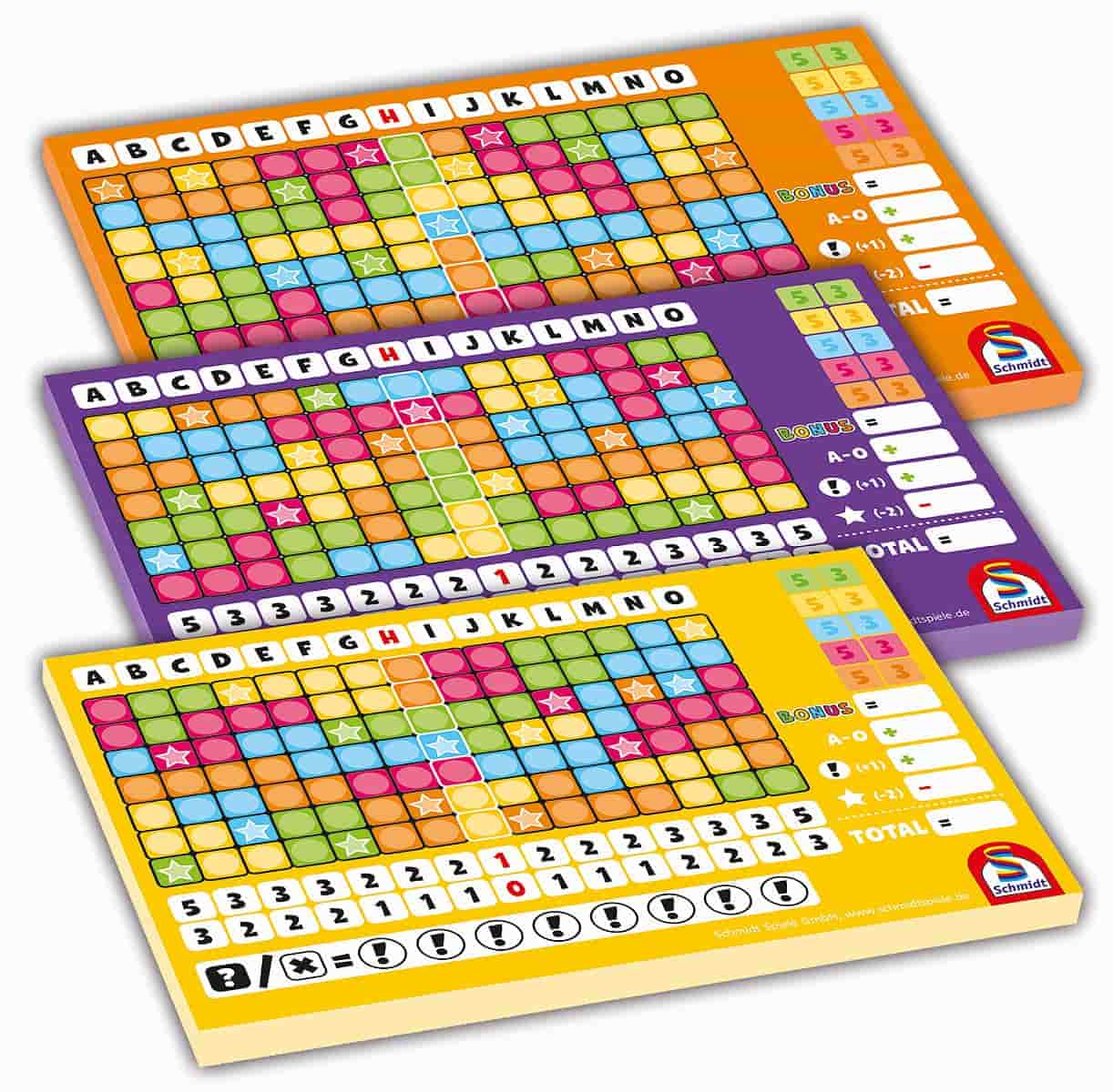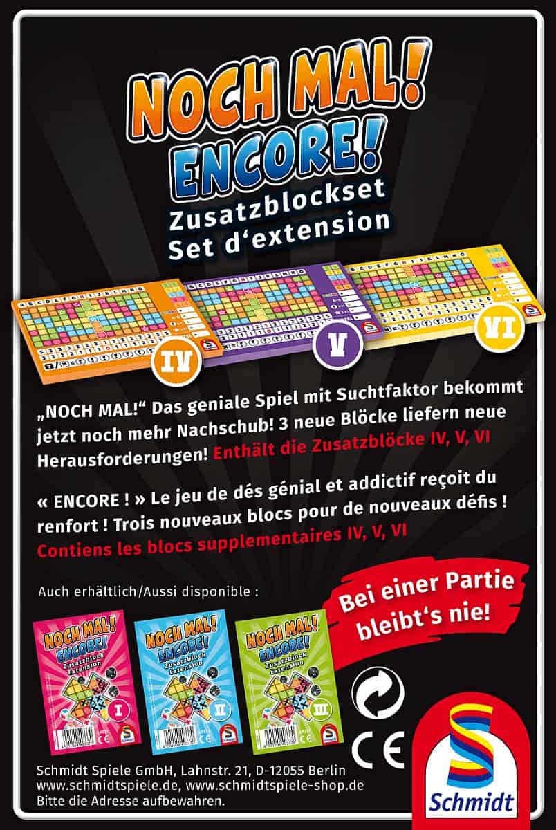 Noch mal! Zusatzblockset is a set of three new booklets (IV, V, VI) with new sheets for use with the Noch mal! dice game. The new arrangements of colors provide a new game experience.