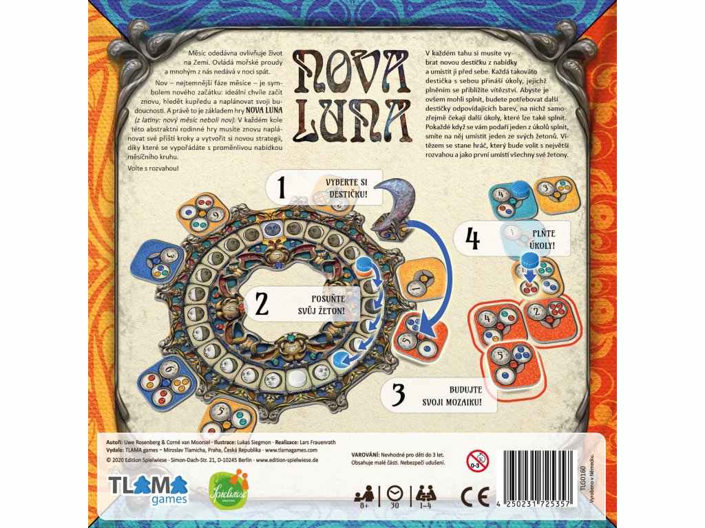 Nov – nejtemnější fáze měsíce – je symbolem nového začátku: ideální chvíle začít znovu, hledět kupředu a naplánovat svoji budoucnost. A právě to je základem hry Nova Luna (z latiny: nový měsíc neboli nov). V každém kole této abstraktní rodinné hry musíte znovu naplánovat své příští kroky a vytvořit si novou strategii, díky které se vypořádáte s proměnlivou nabídkou měsíčního kruhu.