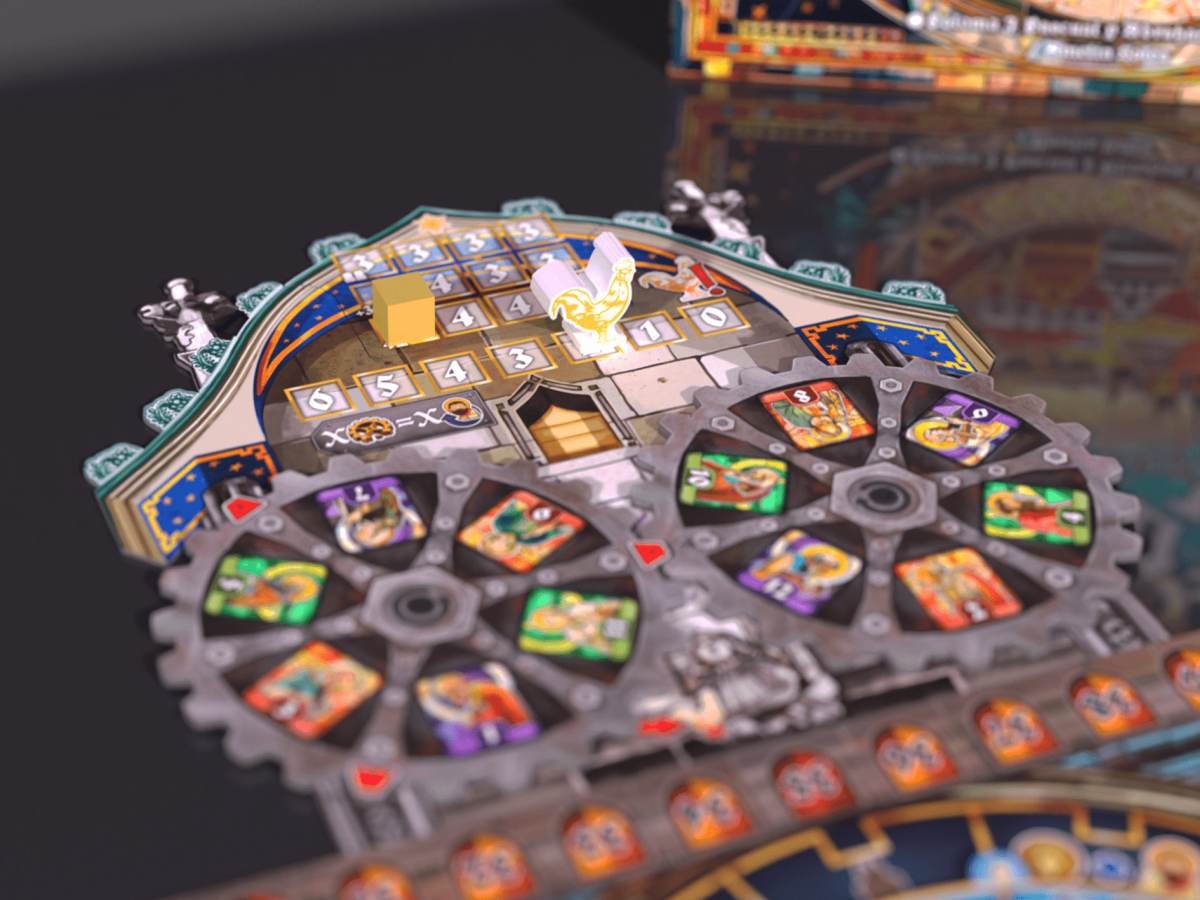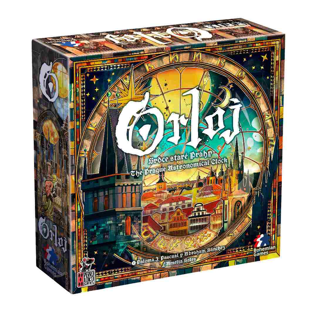 1 herní plán, 1 otočná osa, 1 základna ciferníku orloje, 1 astronomický ciferník, 1 žeton Měsíce, 1 deska Pochod apoštolů, 3 stříšky orloje, 2 soukolí apoštolů, 3 plastové cvočky os (1 náhradní), 1 zlatý kohout, 1 ukazatel kola, 1 malíř, 12 sekcí cisiojánu kalendária, 12 lunárních kruhů, 6 blokátorů měsíců, 12 zvěrokruhů, 6 blokátorů zvěrokruhu, 1 velký ciferník pro finální výstavbu kalendária, 2 žetony kladiv, 18 pomocníků (3 od každého typu), 24 svitků s červenou pečetí, 6 královských svitků s modrou pečetí, 6 vitráží mistrných dovedností, 9 vitráží běžných cílů (3 od každé barvy), 9 bonusů běžných cílů (3 od každé barvy), 21 karet dílny, 6 karet kladiva, 8 karet počátečních surovin, 4 referenční karty dodatečných akcí, 15 žetonů zlata, 20 žetonů barvy, 20 žetonů dřeva, 20 žetonů železa, 18 mincí, 1 pytlík komponenty hráče: 1 deska hráče, 1 kovárna, 1 sklad, 3 kostky produkce,