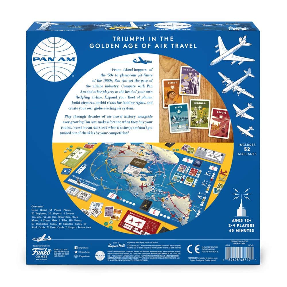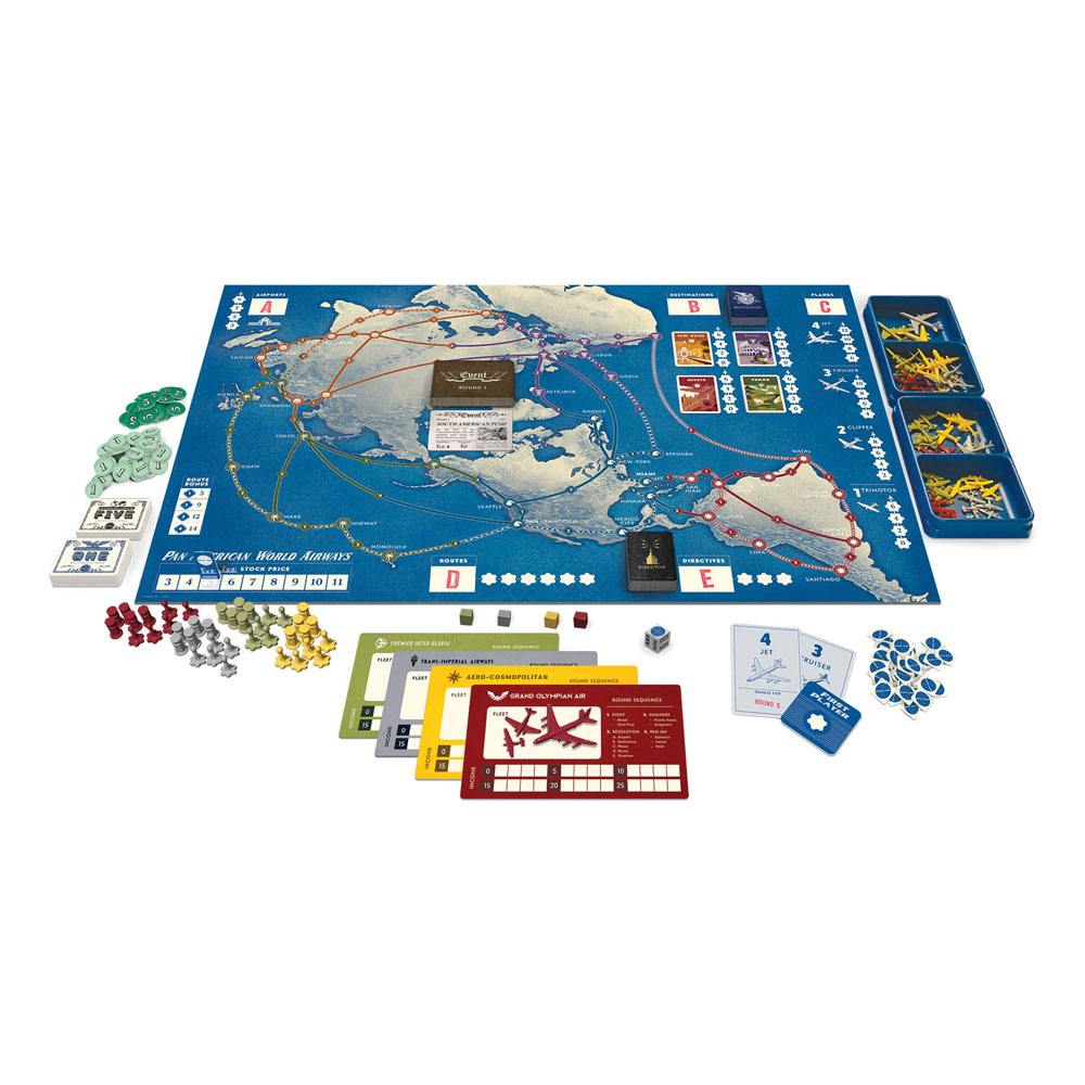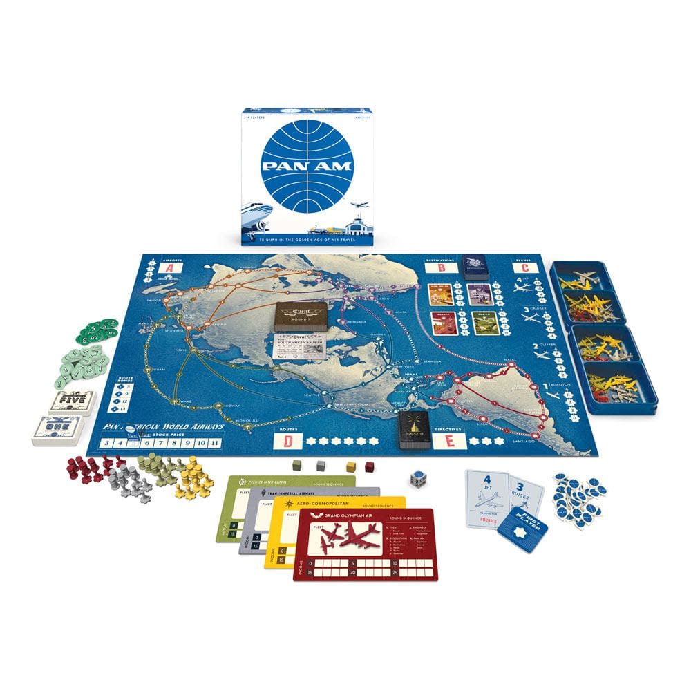 Build your fledgling airline into a booming business that spans the globe with the new board game Pan Am. Expand your routes by sending your engineers to claim new airports, planes, and destinations for your airline, all while using your income to buy Pan Am stock to help build your company. It's a race to see who can acquire the most stock by the end of seven rounds.