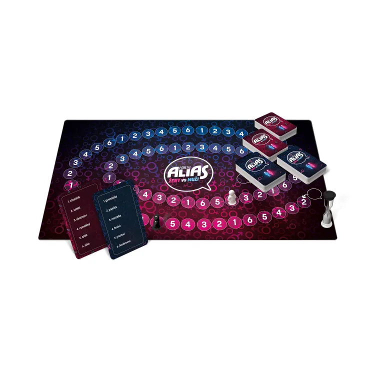 Párty Alias: Ženy vs. muži je týmová párty hra, která staví proti sobě muže a ženy. Hráči vysvětlují a hádají pojmy, které vycházejí ze světa opačného pohlaví. Díky jednoduchým pravidlům, velkému množství karet a možnosti zapojit více hráčů je hra vhodná pro oslavy, večírky i společenské akce.