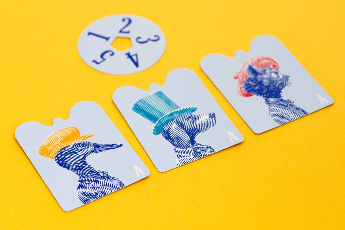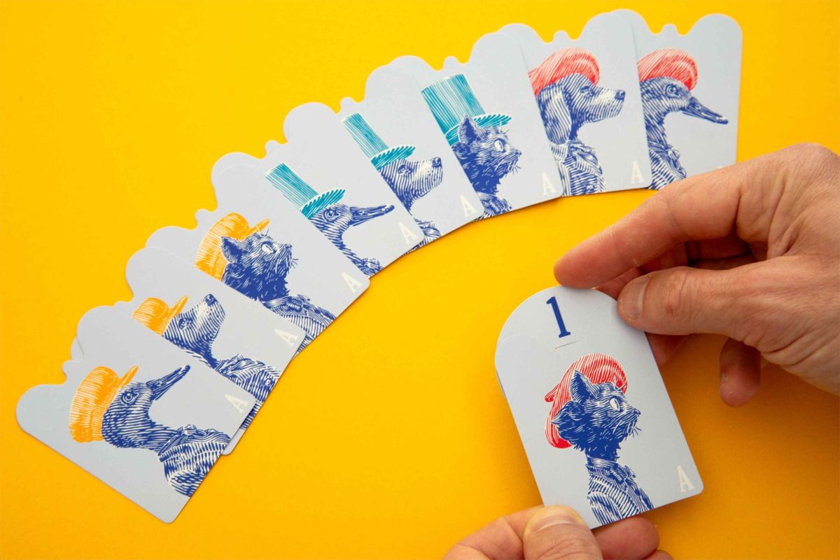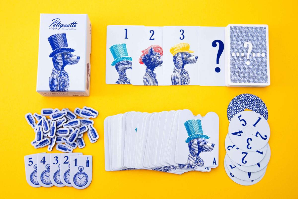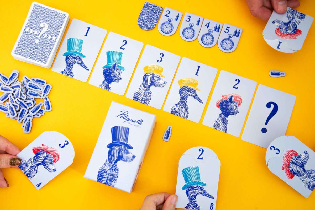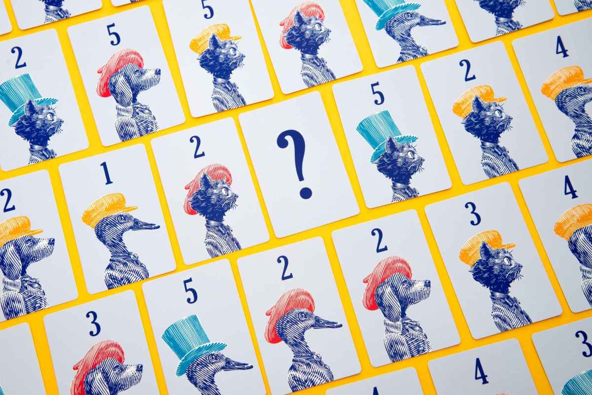 "Petiquette" is a fresh, new kind of game played with cards with combinations of three animals, three hats, and five numbers. Players look at a lineup of five randomly placed cards and try to find some logic or pattern within them. Then they choose which card would most properly fit into that