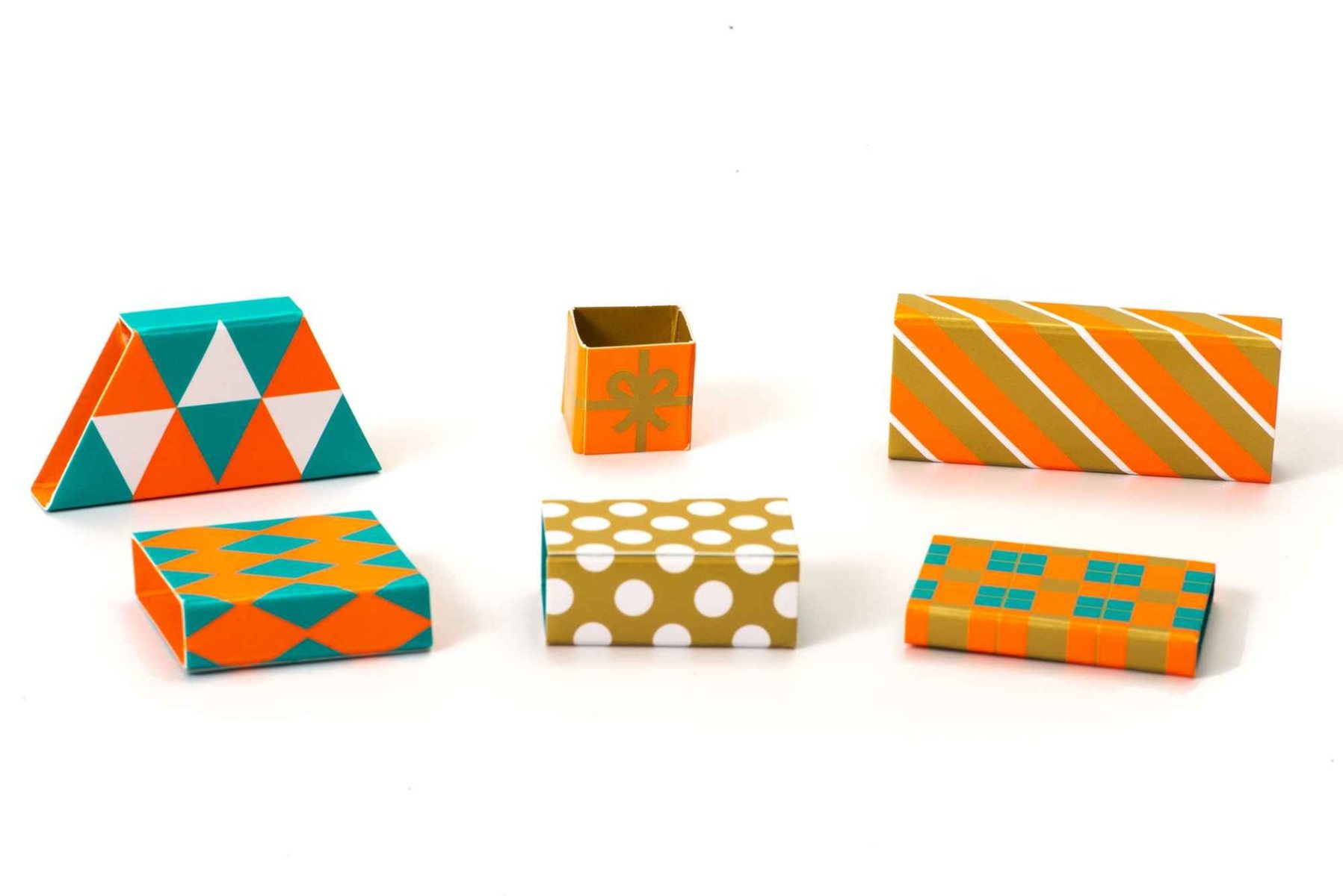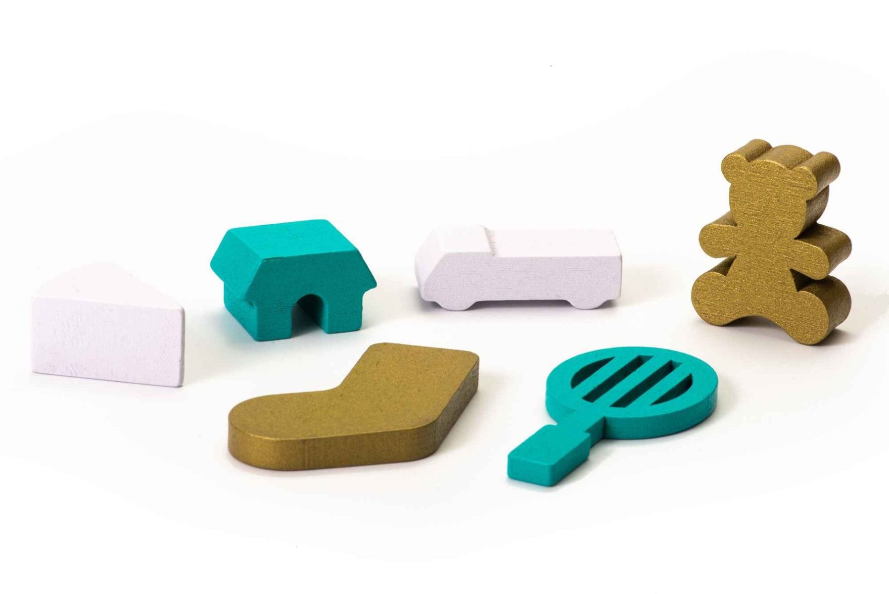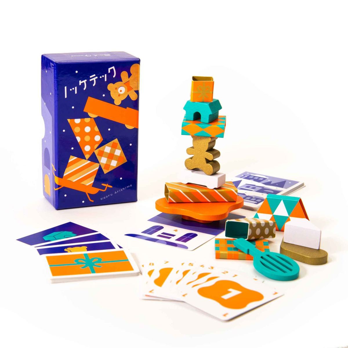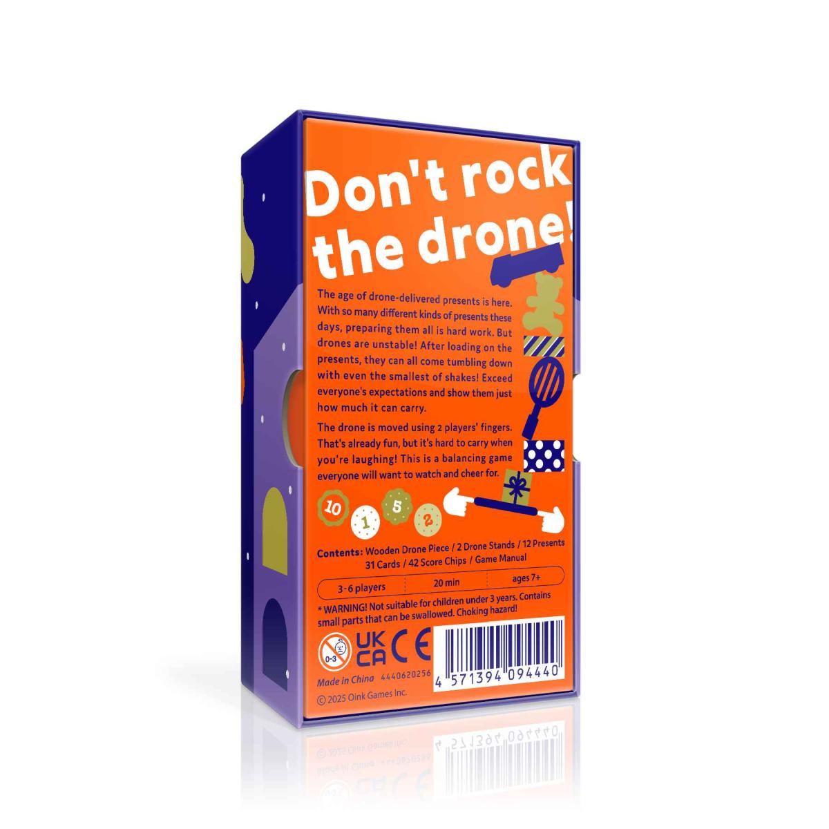 "Pick 'n Packers" is a balance game where two players work together to carry a drone stacked with presents. Each player uses only one finger to pinch and lift a wooden drone piece. Even the slightest difference in finger pressure causes the drone, and the presents on top, to shake, sparking