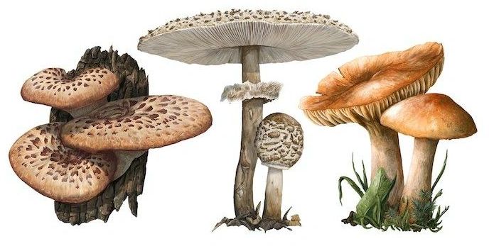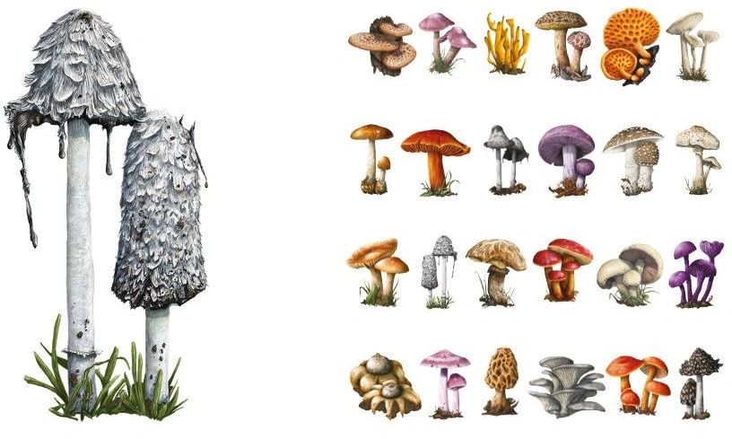 Podhoubí obsahuje krásné a přesné ilustrace v botanickém stylu s více než 69 houbami, které lze najít ve volné přírodě.
