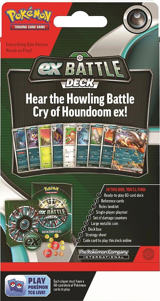 Pokémon TCG Houndoom ex Battle Deck je balení obsahující hotový herní balíček a herní příslušenství. Tento předpřipravený balíček ocení zejména začínající a méně zkušení hráči karetní hry Pokémon TCG. Výhodou tohoto balíčku je, že ho hned po rozbalení můžete hrát. Navíc získáte unikátní ex karty Pokémona Houndoom ex.