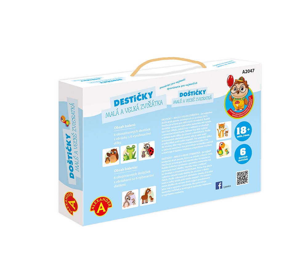 Poznávací jednoduchá naučná hra, která rozvíjí základní schopnosti a znalosti batolat od 18. měsíce věku. Hra ze série "Sovička moudrá hlavička".