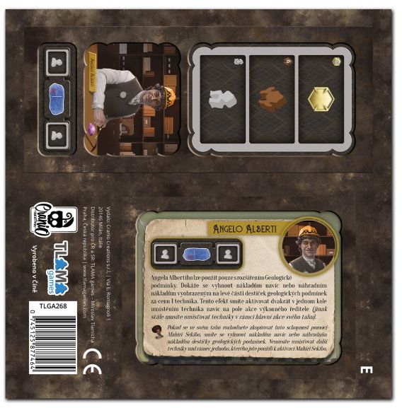 Angelo Alberti - Lze použít pouze s rozšířením Geologické podmínky. Dokáže se vyhnout nákladům navíc nebo náhradním nákladům vyobrazeným na levé části destiček geologických podmínek za cenu 1 technika. Tento efekt smíte aktivovat dvakrát v jednom kole umístěním technika navíc na pole akce výkonného ředitele.