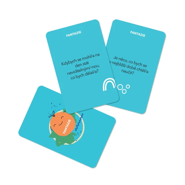 Karty obsahují 100 unikátních otázek rozdělených do 5 tematických kategorií – Na každý den, Fantazie, Moje pocity a emoce, Rodina a kamarádi, Co je lepší?