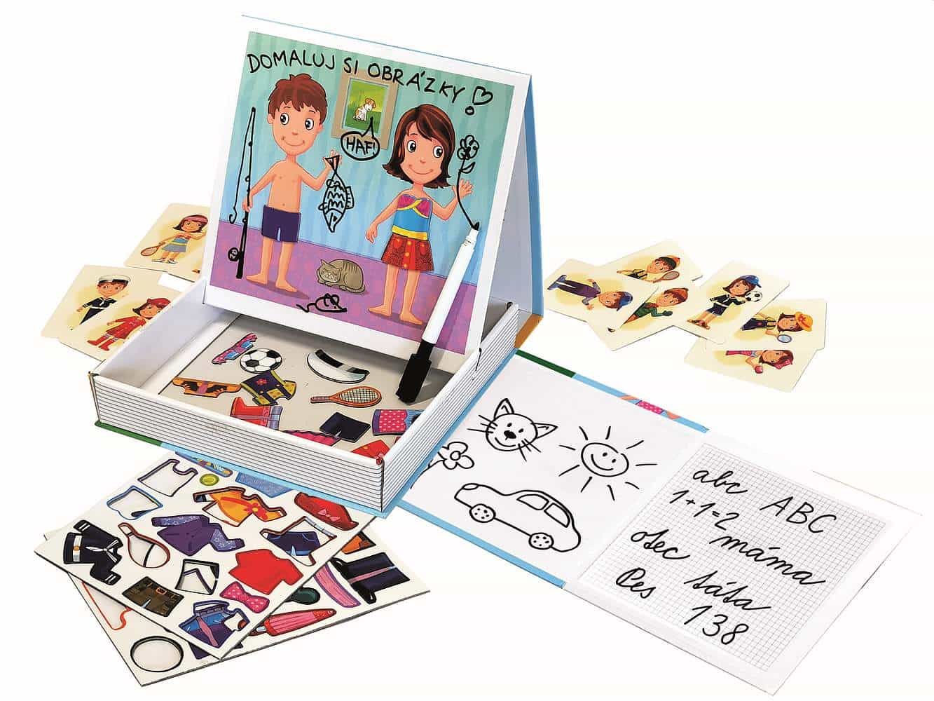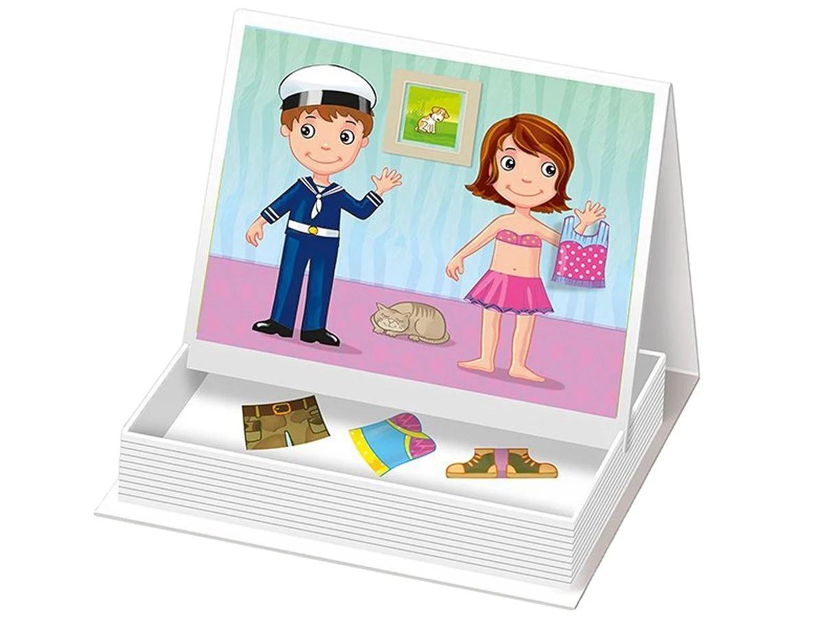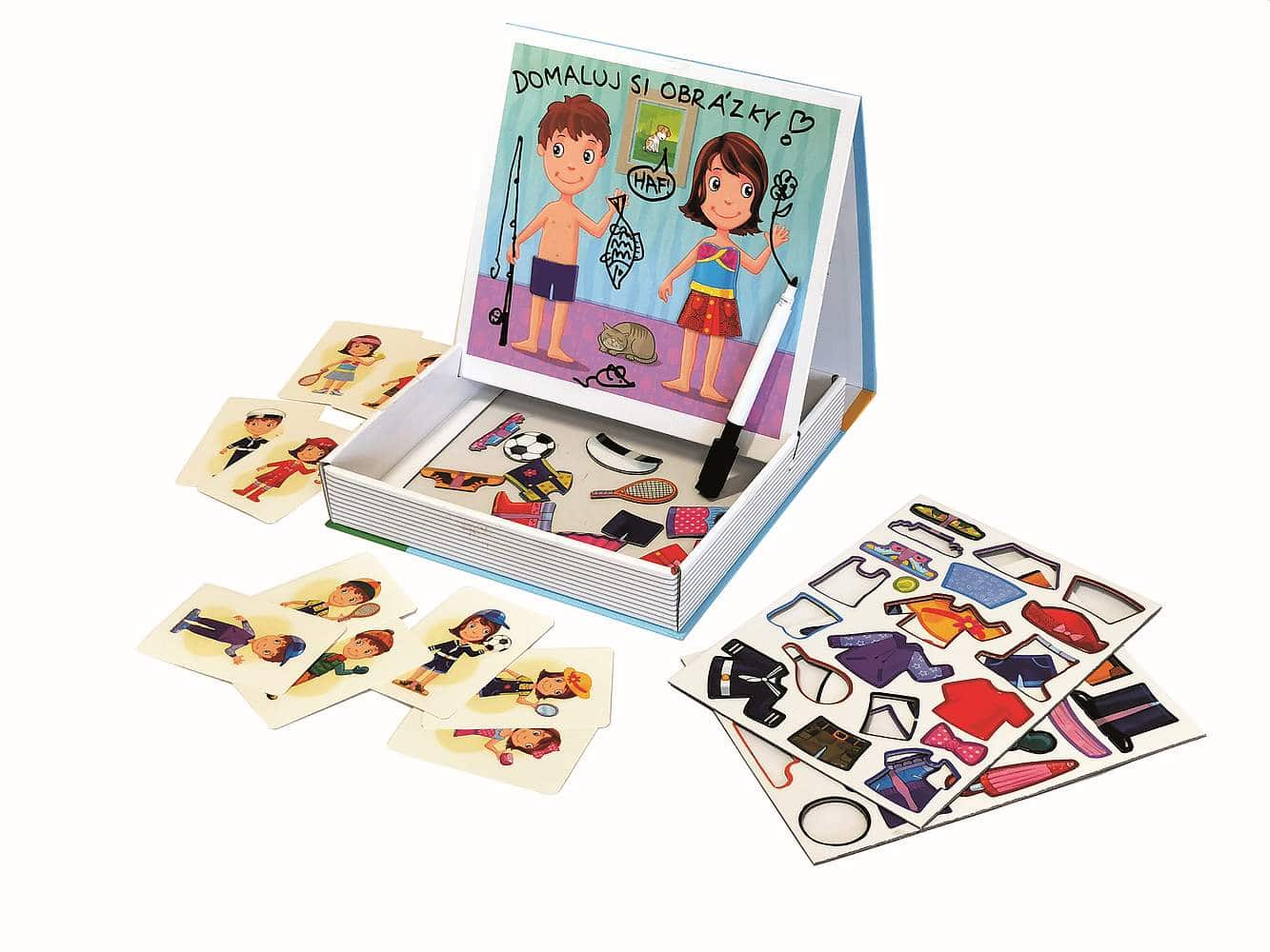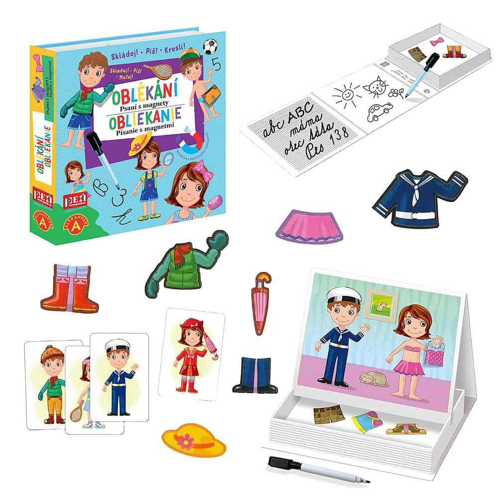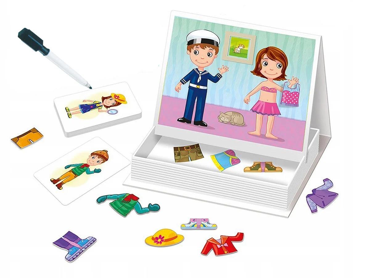 Oblečte postavy chlapečka a holčičky do různorodých modelů a kreací.Obnlékněte je vhodně do deštivého počasí nebo na tenisový kurt. Vytvořte jim příběh pomocí psaní, malování a magnetických předmětů. Potom celý výtvor popisujte a vyprávějte a zlepšujte si vyjadřovací schopnosti. Rozkládací magnetická plocha poskytuje dostatek místa na vlastní psaní a malování fixkou, které snadno smažete koncovnkou na víčku.