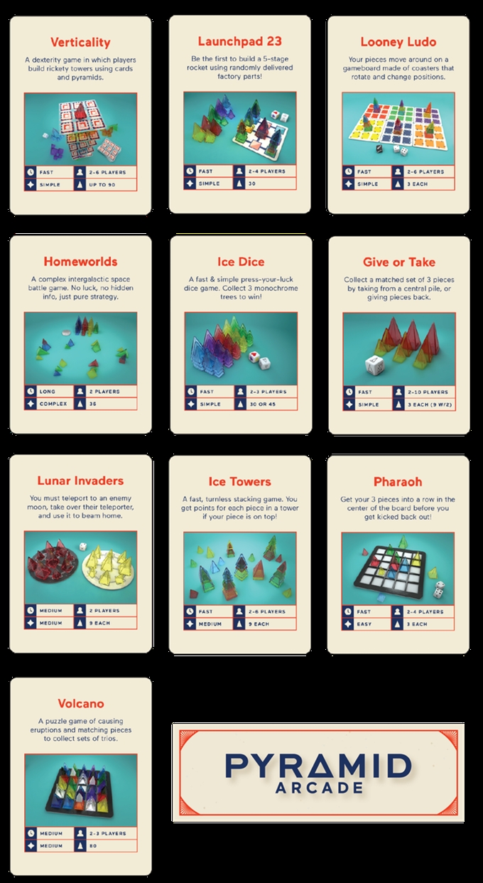 Kompilace Pyramid Arcade patřila v herním světě k nejnadějnějším počinům minulého roku. A naplnila očekávání: od retro-futuristického designu přes výběr těch nejlepších her, které vydalo vydavatelství Looney Labs od roku 1989, až po sestavu komponentů, se kterými se hraje. Nezáleží, jestli s hraním začínáte, nebo jste již ostřílení hráči her Looney Labs. Ve výběru najdete širokou škálu her: od rychlých po časově náročné hry, od her postavených na náhodě po těžce strategické, od jednoduchých kratochvílí až po hlavu lámající obtížnosti.