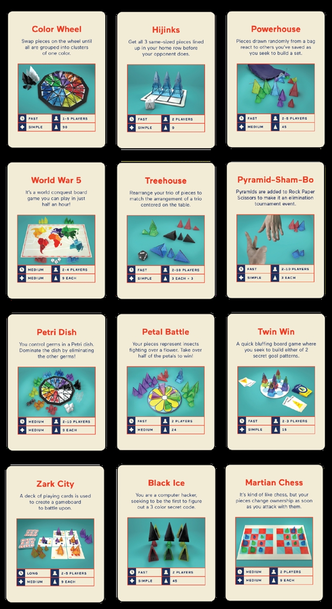 Konkrétně zde najdete tyto hry včetně podrobného návodu v angličtině ke každé z nich: Black Ice, Petal Battle, Color Wheel, Petri Dish, Give or Také, Pharaoh, Hijinks, Powerhouse, Homeworlds, Pyramid-Sham-Bo, IceDice, Treehouse, IceTowers, Twin Win, Launchpad 23, Verticality, Looney Ludo, Volcano, Lunar Invaders, World War 5, Martian Chess, Zark City.