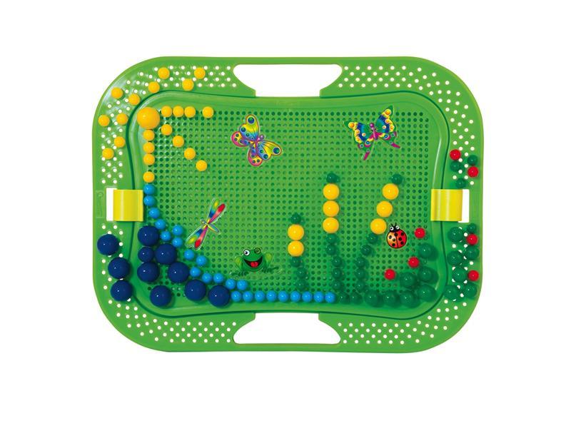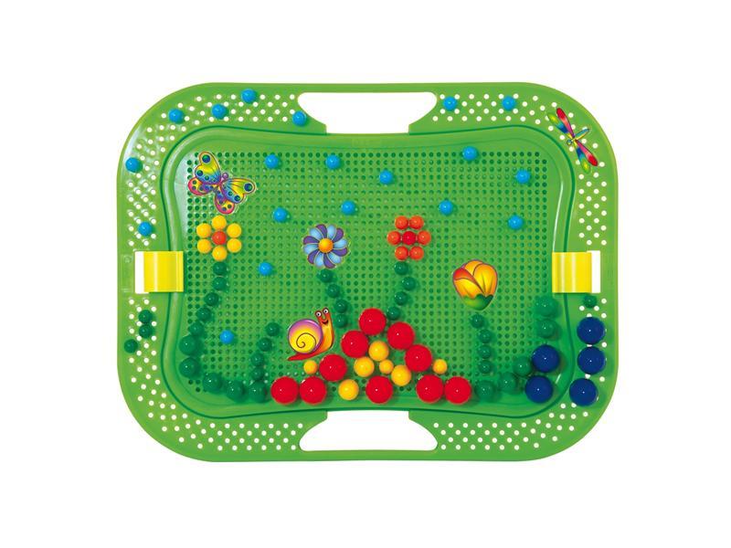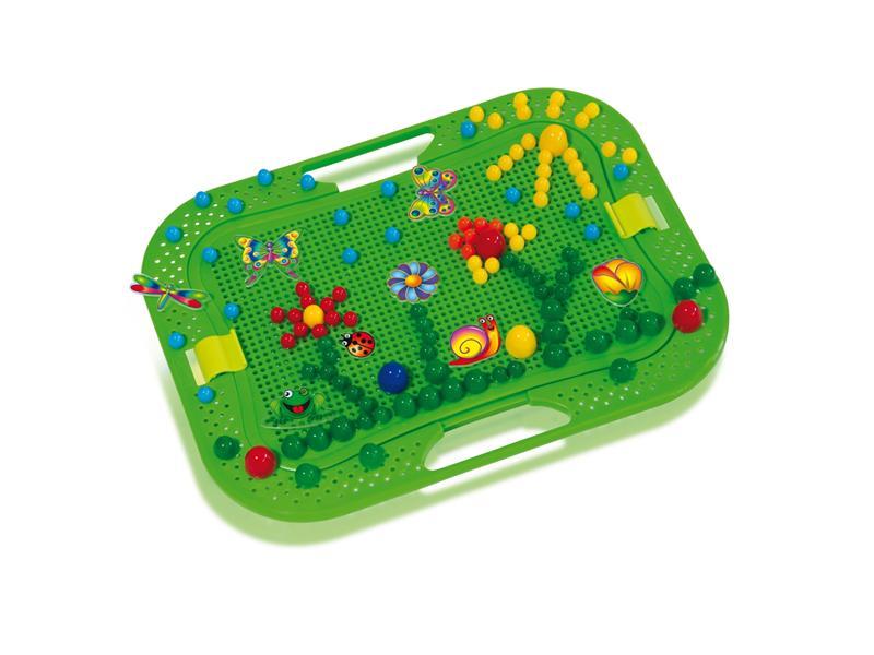 Tematicky zaměřená mozaika rozvíjející manuální zručnost, vizuomotorickou koordinaci a tvořivé myšlení. Pomocí plastových kolíčků různých velikostí dítě skládá obrázky, které může díky speciálním doplňkům obohatit i o zvířátka a květiny, s nimiž se na zahradě může setkat. Kufřík se dvěma úchyty, ve kterém je vše úhledně uklizeno, dělá z této mozaiky ideální hračku na cesty.