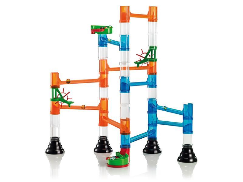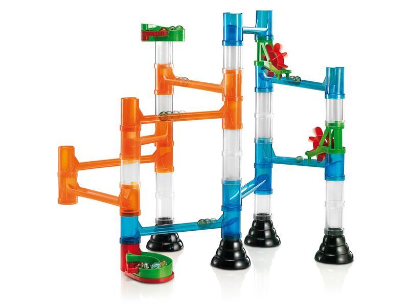 Vytvořte si díky naší skvělé stavebnici svou vlastní kuličkovou dráhu! Sestavte modely vyobrazené na krabici nebo zkuste vymyslet vlastní návrhy. Vzájemně do sebe zapadající skluzavky, můstky, sloupky i lopatková kola vám nabízejí nekonečnou škálu možností a přinášejí spoustu zábavy na dlouhou dobu.
