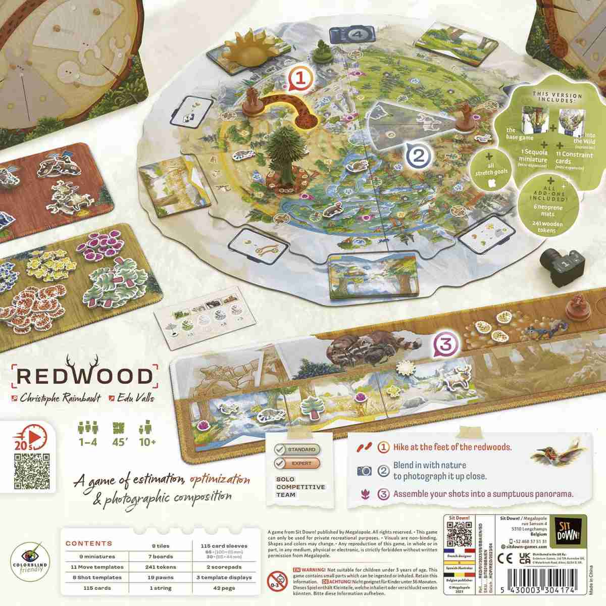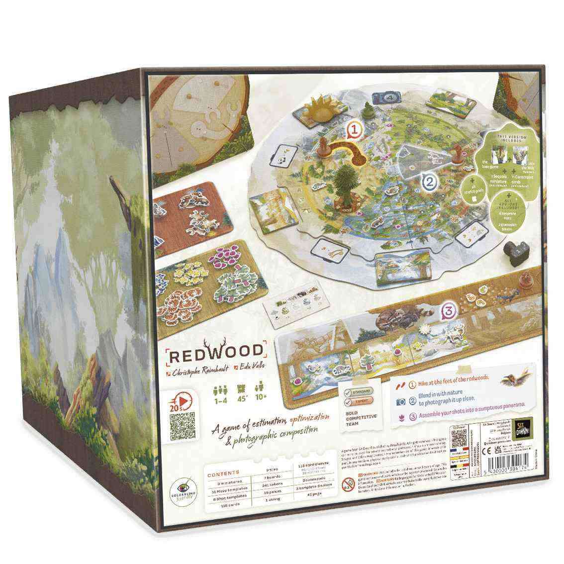 "Dazzle your audience by showcasing your skills as a wildlife photographer. Capture a stunning panorama, express your artistry through a rich diversity of flora and fauna in your shots, and, by the end of the game, be the player with the most harmony points.Redwood is a game of estimation. On your turn, choose a Movement template and a Target template. The first allows you to move your figure across the board (without disturbing the animals), while the second lets you capture nature and its inhabitants on the Panorama card you’ve selected.More than just a game, it’s a true bucolic adventure…This Big Box includes all expansions, goodies, and available upgrades for the game."