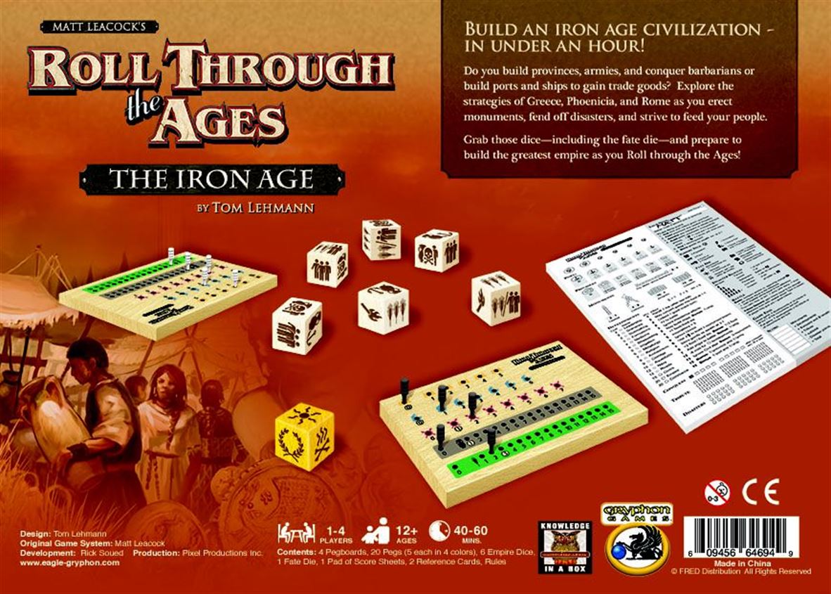 Roll Through the Age: Iron Age umožňuje hráčům, aby se učili různým způsobům budování říší u úspěšných civilizací. Mohou se nechat inspirovat obchodní a námořní strategií Féničanů, vojenstvím Alexandra Velikého nebo technickou vyspělostí Římské republiky.