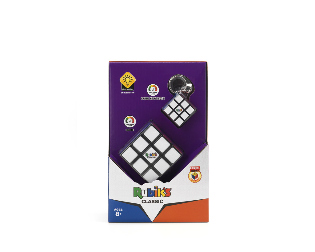 Multibalení obsahující základní Rubikovu kostku 3×3 a funkční přívěsek malé 3×3 kostky.