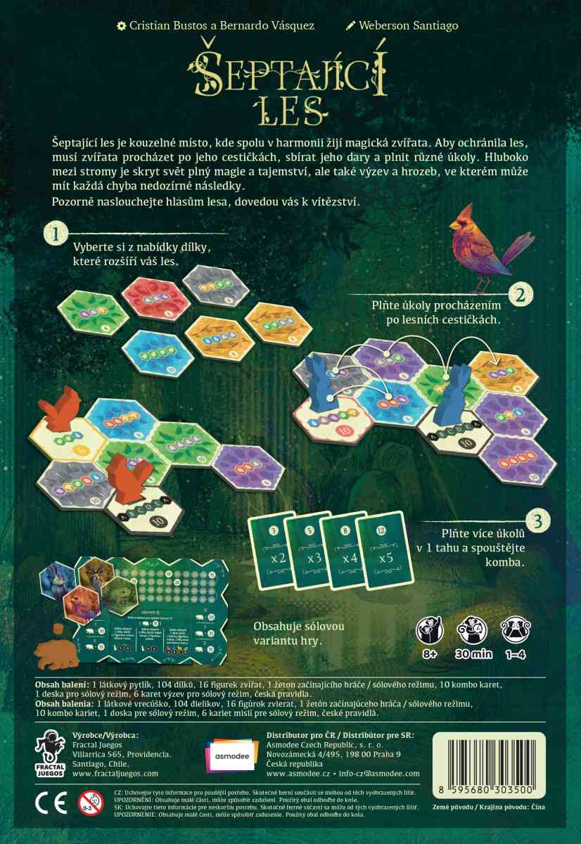 Šeptající les je kompetitivní hra plná plánování, rozhodování a umísťování dílků. Hra se hraje na kola, během kterých hráči rozšiřují svůj les. Musíte si vybrat dílky z nabídky, umístit je do své herní oblasti a pokusit se splnit různé úkoly. Vyhraje hráč, který bude mít na konci hry nejvíc vítězných bodů.