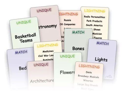 Obsah:108 oboustranných karet - 36 karet se 72 zadáními z každé kategorie Match, Unique a Lightning
