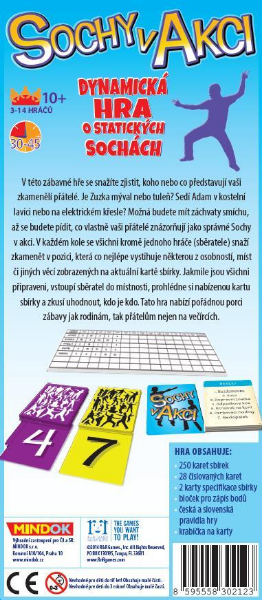 V této zábavné hře se snažíte zjistit, koho nebo co představují vaši zkamenělí přátelé. Je Zuzka mýval nebo tuleň? Sedí Adam v kostelní lavici nebo na elektrickém křesle? Možná budete mít záchvaty smíchu, až se budete pídit, co vlastně vaši přátelé znázorňují jako správné Sochy v akci. V každém kole se všichni kromě jednoho hráče (sběratele) snaží zkamenět v pozici, která co nejlépe vystihuje některou z osobností, míst či jiných věcí zobrazených na aktuální kartě sbírky. Jakmile jsou všichni připraveni, vstoupí sběratel do místnosti, prohlédne si nabízenou kartu sbírky a zkusí uhodnout, kdo je kdo. Tato hra nabízí pořádnou porci zábavy jak rodinám, tak přátelům nejen na večírcích.