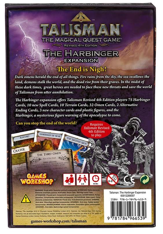 The end of the world is nigh in Talisman: The Harbinger. This expansion introduces the Harbinger, a mysterious figure of prophecy and doom who wanders the realm, with destruction following everywhere he walks. As the demons and plagues of the new Harbinger deckwreak havoc throughout Talisman, three new powerful characters seek the Crown of Command. That quest becomes more dangerous than ever before: cursed followers lie in wait for fresh prey, flames descend from the darkened skies, and the dead crawl from their tombs.