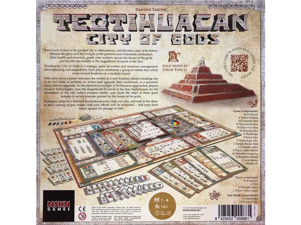 Teotihuacan: City of Gods je strategická hra o správě pracovníků a surovin, dobrém plánování a schopnosti přizpůsobit se. Každý hráč ovládá skupinu pracovníků v podobě kostek, jež se pohybují po lokacích na modulární herní desce.