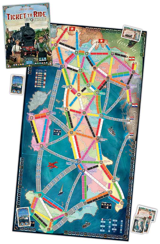 This Ticket to Ride© expansion also includes the Italy map which is focused on the Regions in this country and on a brand new type of Ferry Route. Connect cities from all Regions in the same network to score extra points.