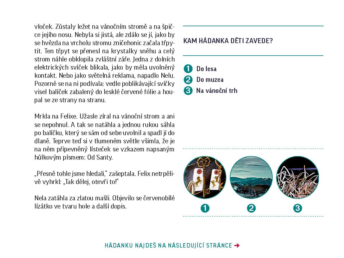 Poslední dny před Vánoci plánuje Nela strávit v pohodě u počítače nebo pojídáním cukroví. Jenže pak se začnou dít podivné věci. Její spolužák Max chodí do školy totálně vyřízený, ale nechce jí prozradit proč. Když si Nela všimne záhadného stínu přistávajícího na střeše Maxova domu a kamarád následující den chybí, je jí jasné, že to není jen tak. Máte dost odvahy a důvtipu? Jen když postupně vyluštíte všech 24 zapeklitých hádanek, dokážete osvobodit Maxe a další děti z vánoční pasti!