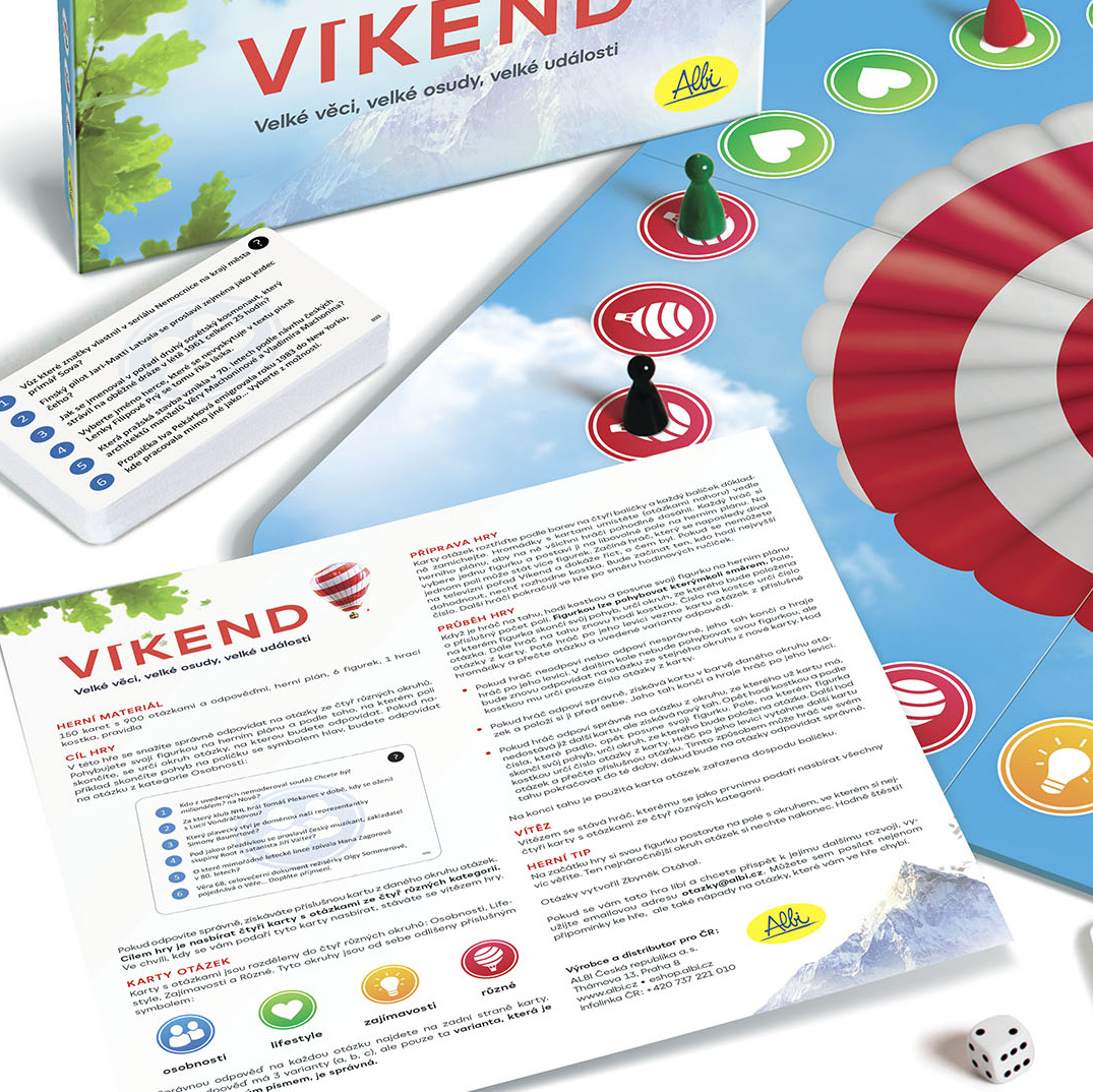 Hra Víkend je hra pro celou rodinu, která vás bude těšit, bavit a při které si odpočinete jako o víkendu. 900 otázek zahrnuje mnoho různých oborů a je rozděleno do 4 kategorií: osobnosti, lifestyle, zajímavosti a různé.
