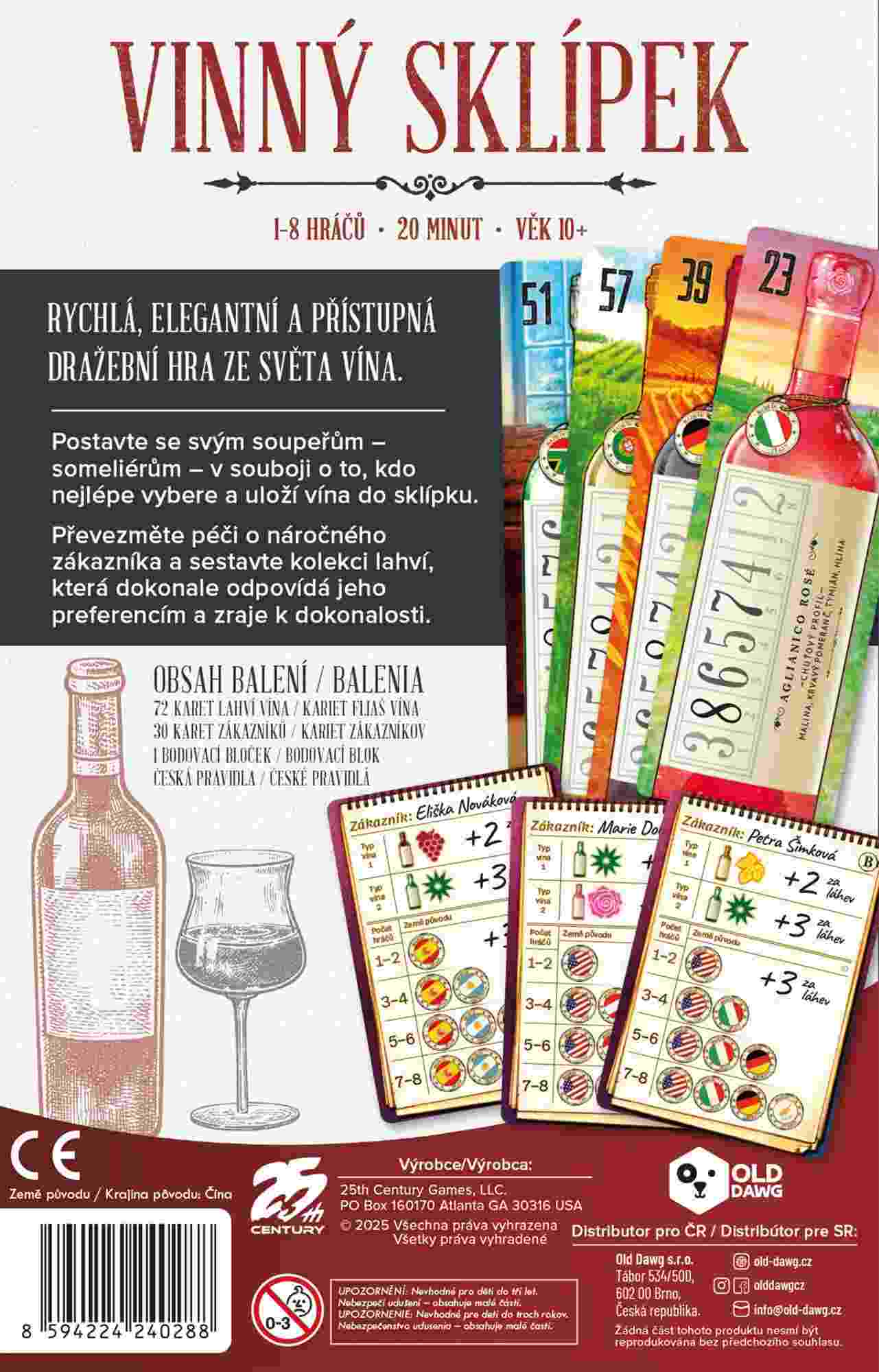 Vinný sklípek je svižná karetní hra pro 1 až 8 hráčů, ve které se stanete sběrateli a znalci vína, kteří se snaží sestavit co nejcennější kolekci vzácných lahví.