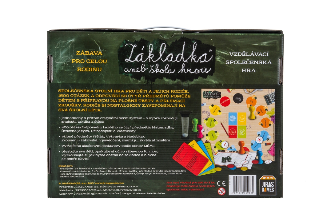 Stolní hra Základka je moderní kombinací vzdělávací pomůcky a zábavné aktivity. Obsahuje 1600 testových otázek ze 4 základních předmětů, které vytvořili zkušení učitelé z několika základních škol a které svým rozsahem zahrnují osnovy právě pro pátou třídu. Kombinace zábavných pravidel, příjemného herního plánu a veselých předmětů Výtvarka, Hudebka a Tělák vytváří mix aktivit, které školáky i jejich rodiče přivedou k učení, aniž by školák vnímal, že se právě učí. V každé chvíli jde totiž o hru a cílem není nutně získat na herní vysvědčení samé jedničky, ale hlavně se dobře pobavit a přitom si něco zopakovat a něco se dozvědět. Ale pozor, školákem se může stát i rodič a díky konceptu hry si doma můžete zahrát na třídu, ve které děti vyzkouší své rodiče a ještě se přitom samy něco naučí.
